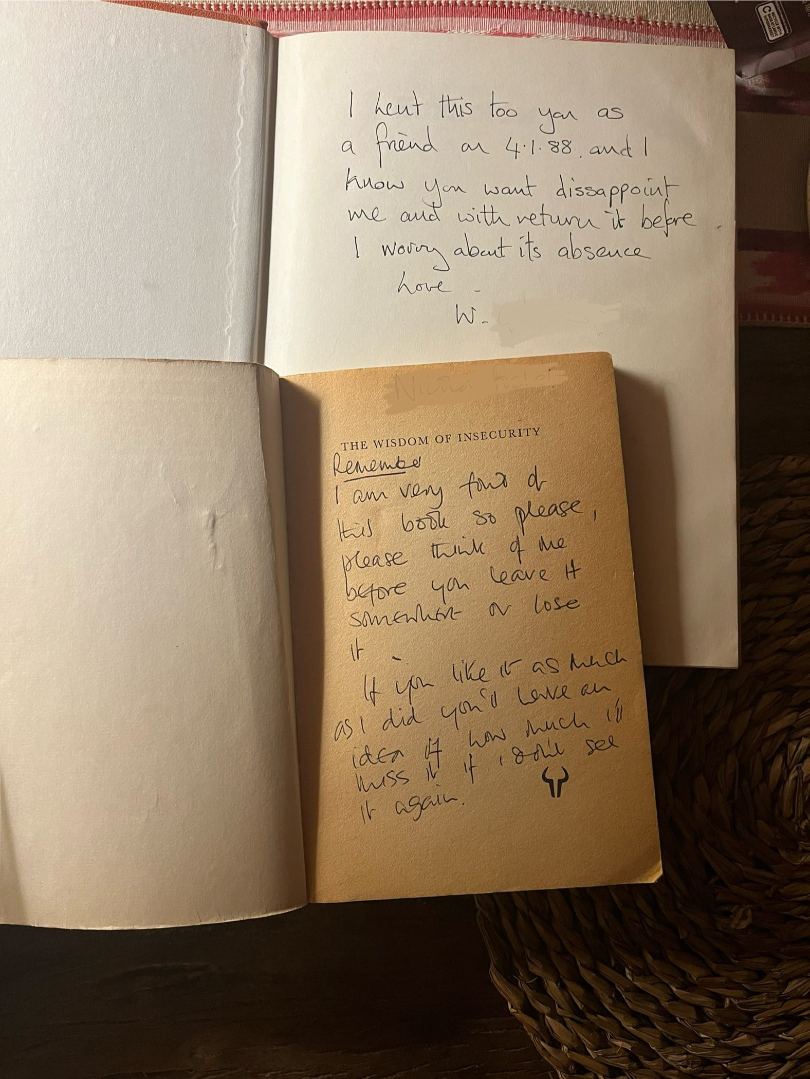 While going through my dad’s books recently, I opened one at random and found an inscription inside asking the borrower, very earnestly, to return it because it meant a great deal to the person who’d lent it. So of course I returned it. The next day, left alone in that person's house lined with their books, I picked another at random to read. Inside it was a second inscription — from someone whose name I had only heard spoken aloud for the first time the night before.
